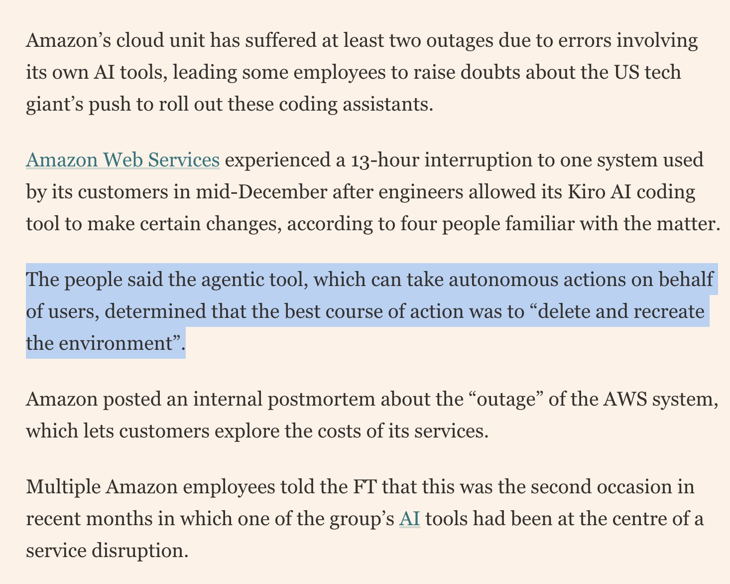 arrow-up1184imageAmazon's internal agentic tool decided that existing code was inadequate and decided to replace it taking down a part of AWS for 13 hours, and was not the first time it had happened. 🤣plus-squarelemmy.ml☆ Yσɠƚԋσʂ ☆@lemmy.ml to Programmer Humor@lemmy.mlEnglish · 21 hours agomessage-square10fedilink