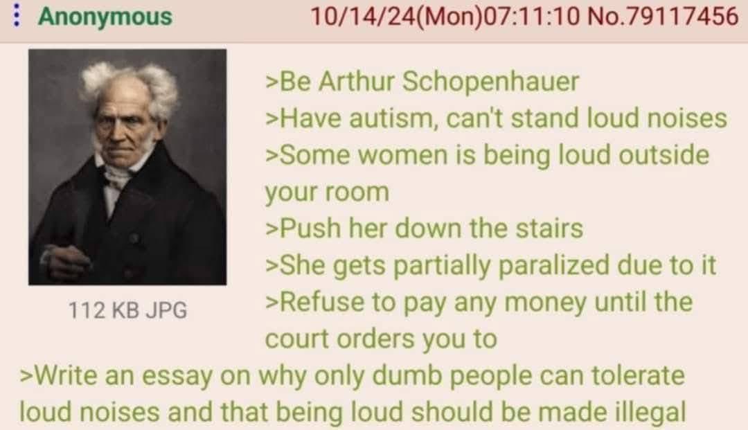 🍹Early to RISA 🧉@sh.itjust.worksM to Greentext@sh.itjust.works · 10 hours agoAnon is Arthur Schopenhauersh.itjust.worksimagemessage-square24fedilinkarrow-up1223