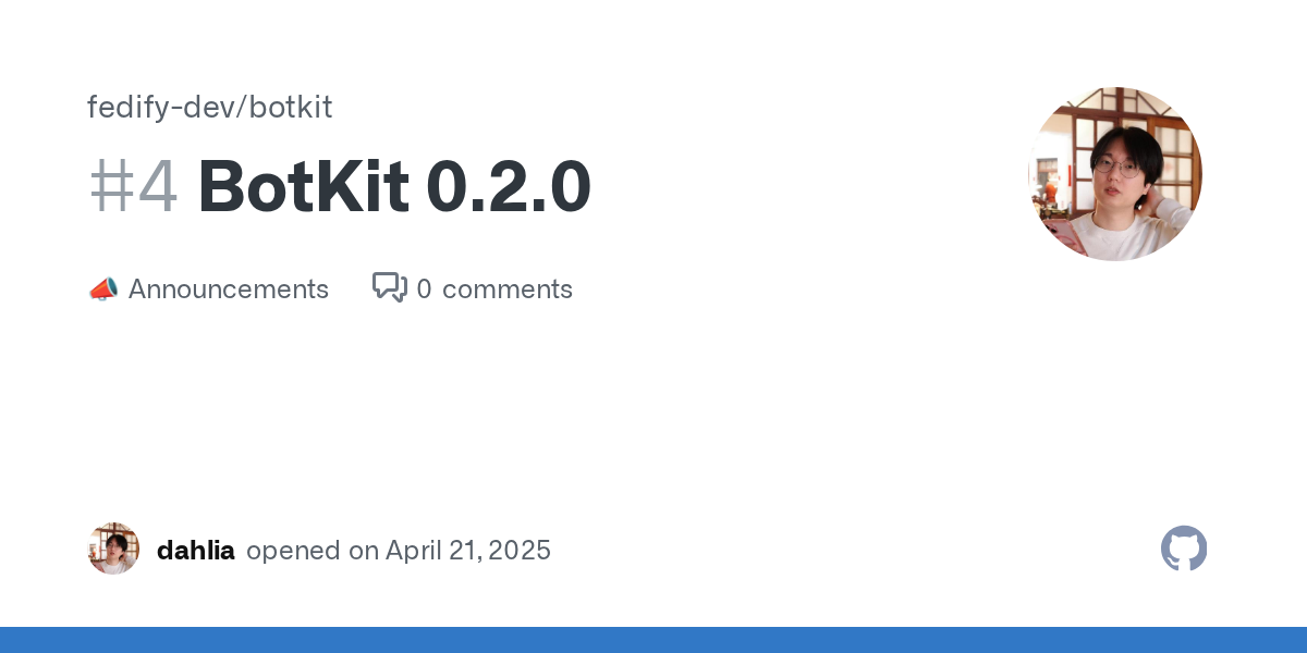 洪 民憙 (Hong Minhee)@lemmy.mlEnglish · 10 months agoBotKit 0.2.0 releasedplus-squaregithub.comexternal-linkmessage-square0fedilinkarrow-up11
