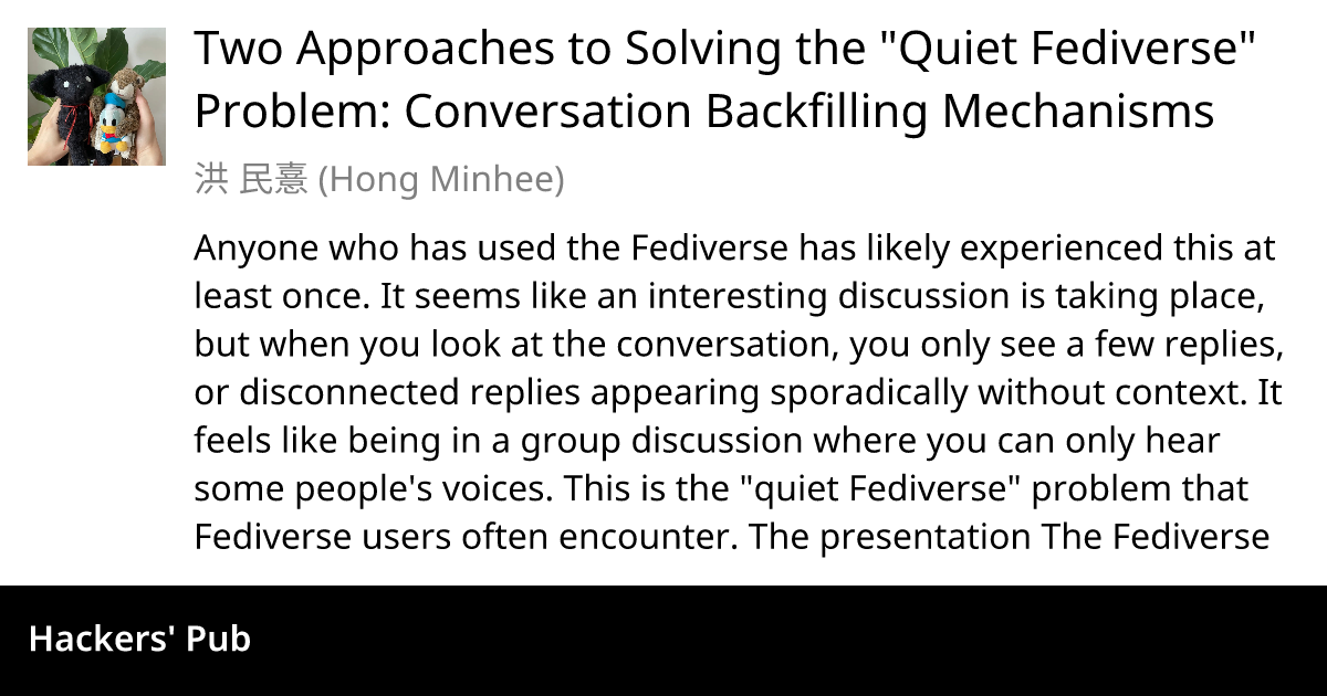 洪 民憙 (Hong Minhee)@lemmy.mlEnglish · 9 months agoTwo Approaches to Solving the “Quiet Fediverse” Problem: Conversation Backfilling Mechanismsplus-squarehackers.pubexternal-linkmessage-square0fedilinkarrow-up11