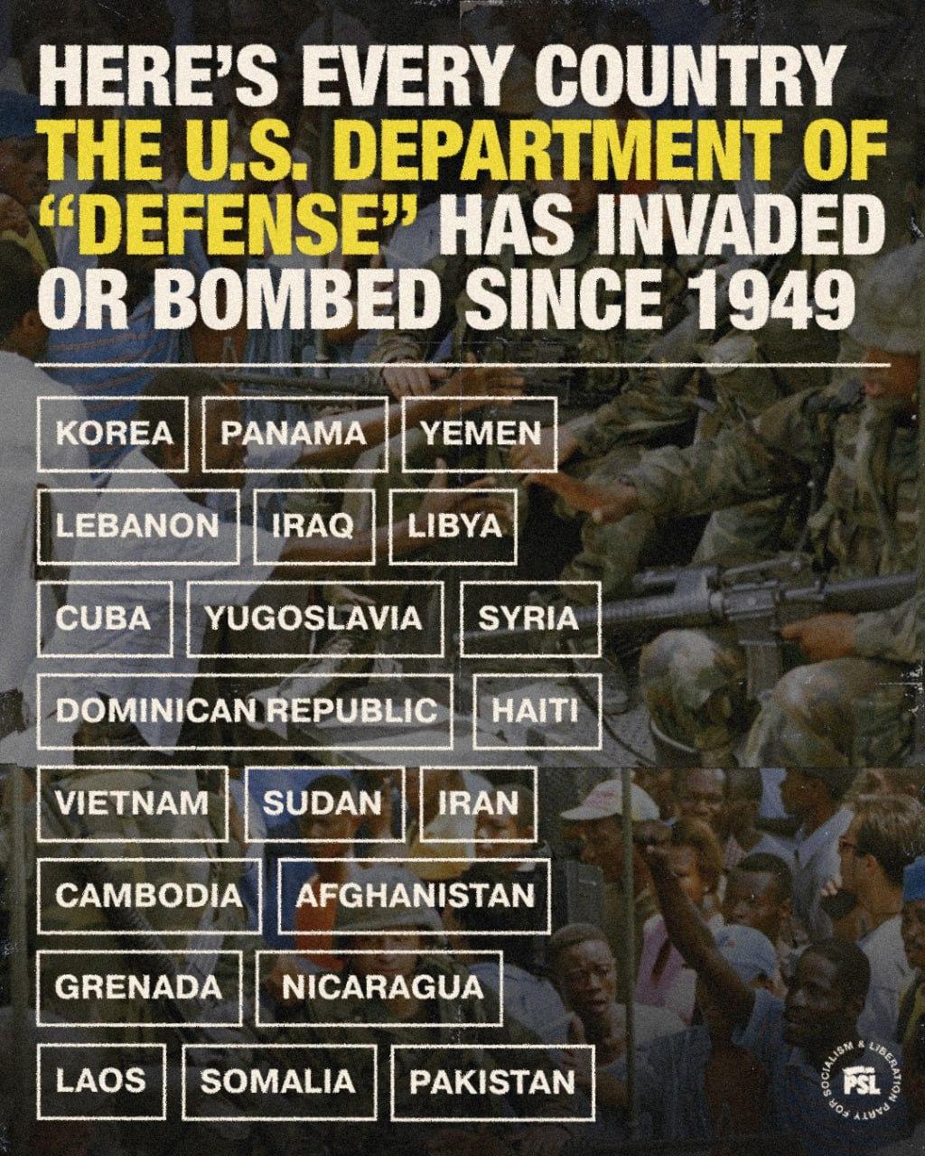 Spectre@lemmy.ml · edit-25 months agoHere's every country the US department of defense has invaded or bombed since 1949plus-squarelemmy.mlimagemessage-square0fedilinkarrow-up11