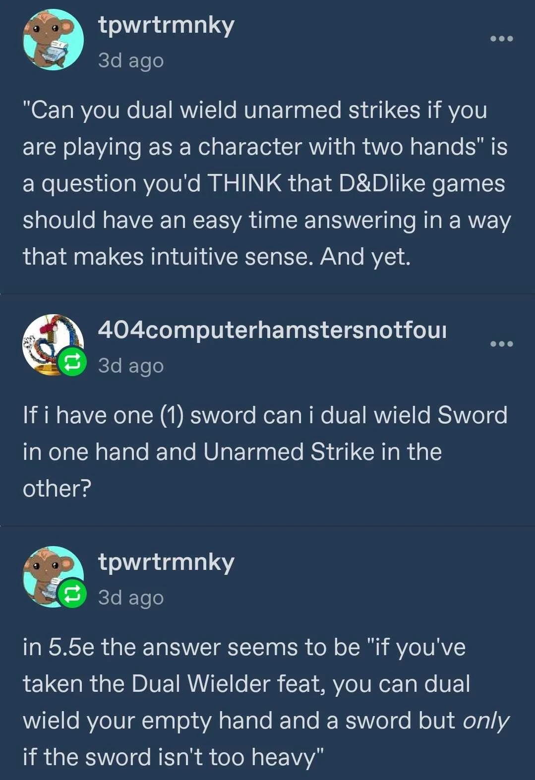 tgirlschierke@lemmy.blahaj.zoneEnglish · 10 hours agoDual Wielding [Dungeons & Dragons]lemmy.blahaj.zoneimagemessage-square22fedilinkarrow-up1186