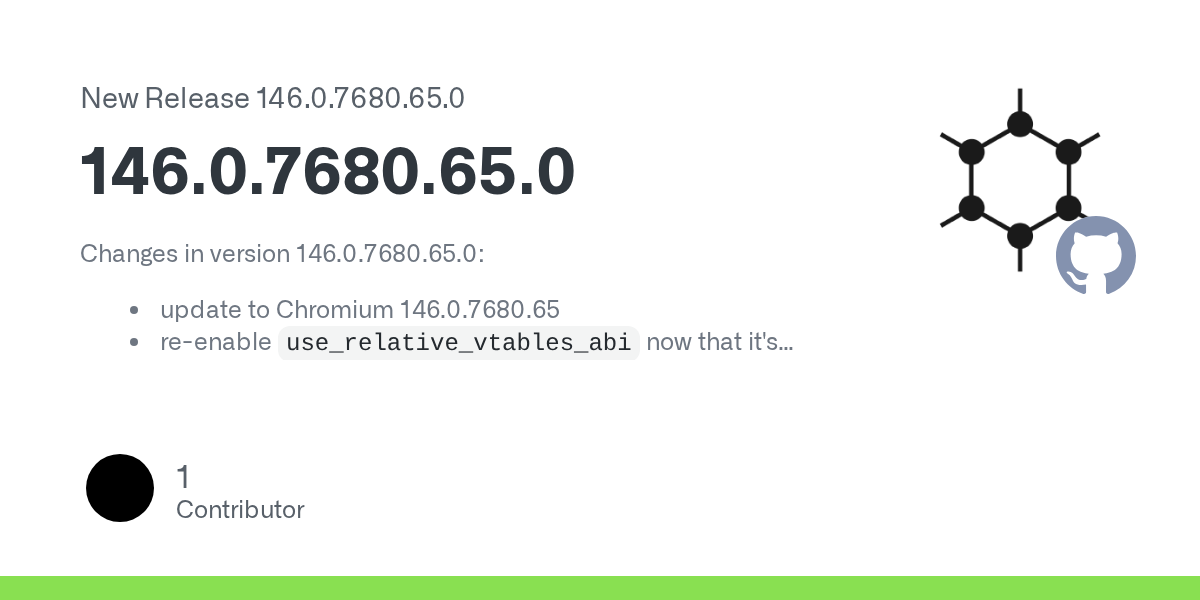 use_relative_vtables_abinow that it’s compatible with Control Flow Integrity (enabled by GrapheneOS) on arm64 / AndroidA full list of changes from the previous release (version 146.0.7680.31.0) is available through the Git commit log between the releases.