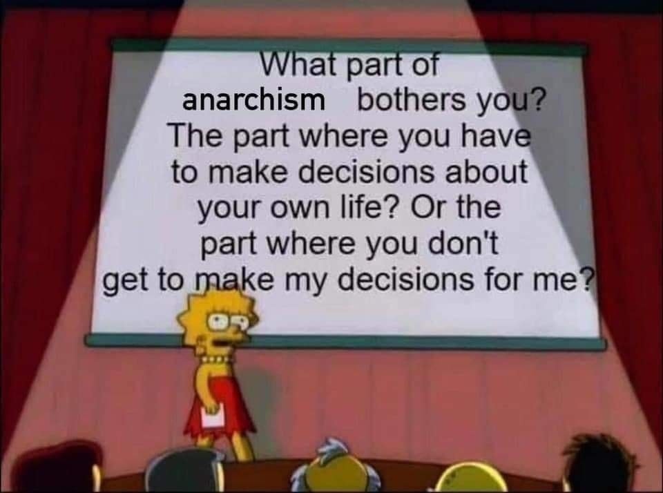 Anarchism is not a world devoid of rules, in fact it’s all about rules. Except these are rules mutually-agreed upon by members of the community rather than dictated by politicians with no interest in the well-being of the community.