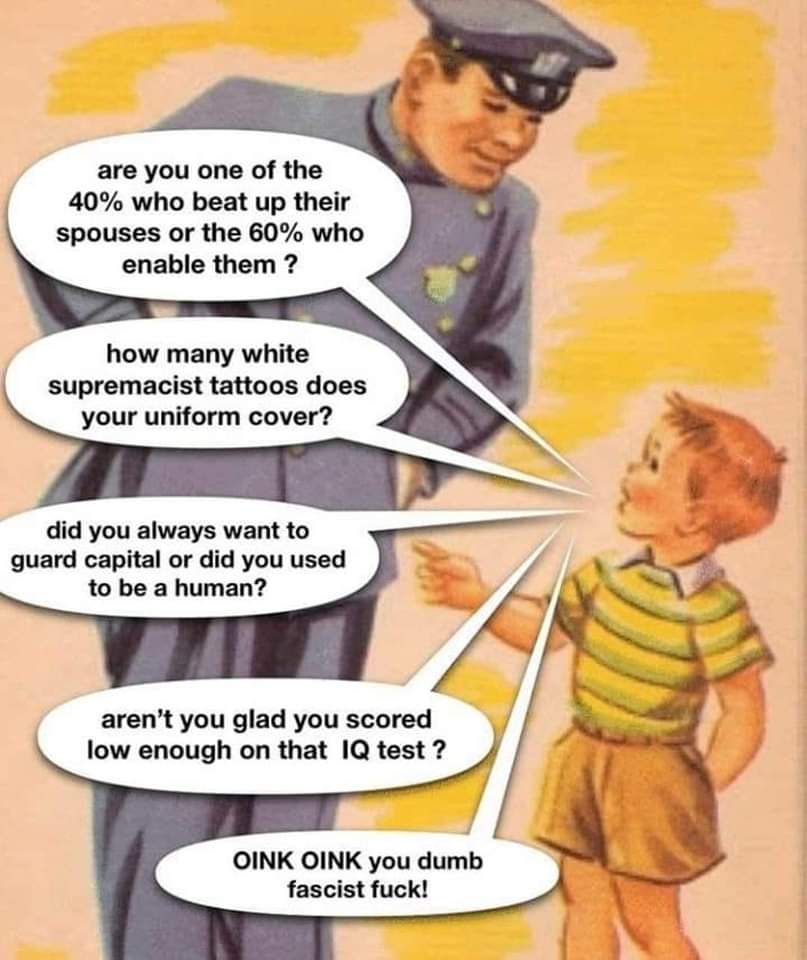 I love how every acab post inevitably brings out a bunch of uninformed libs in the comments talking about how pigs are only bad in America (as though the term ACAB was invented in America…) or how a society without them is completely inconceivable. As though badges grow on trees, like police are just a natural thing that sprung out of the ground.