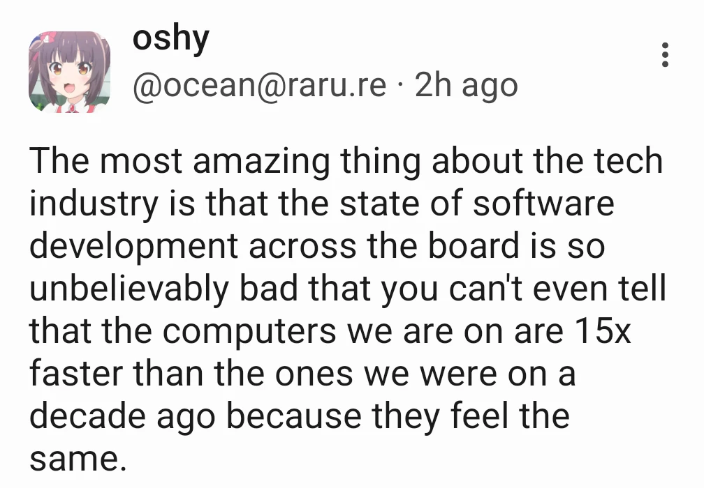With respect to OP’s post, they say “you can’t even tell the computers we are on are 15x faster…”, and I reckon that quick resume etc, is an example of “you absolutely can tell that we now have extremely fast hardware” when compared to what came before, irrespective of the quality of the software.