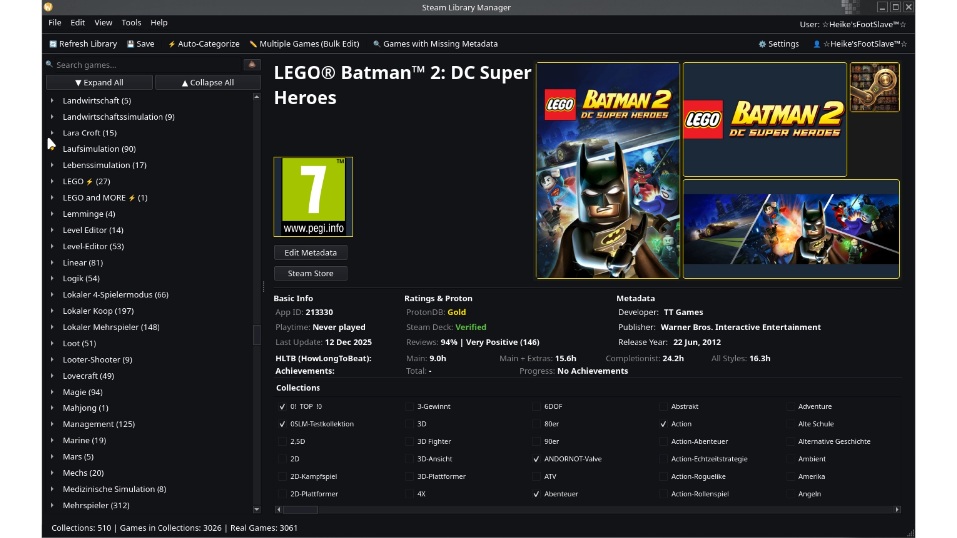 Auto-categorize by 17 rule types: Tags, Genres, ProtonDB rating, Steam Deck status, HowLongToBeat, Achievements, PEGI (Age Ratings), and more
