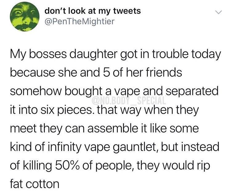 arrow-up1502imageInfinity vape gauntletlemmy.worldickplant@lemmy.world to Lemmy Shitpost@lemmy.world · 11 hours agomessage-square44fedilink