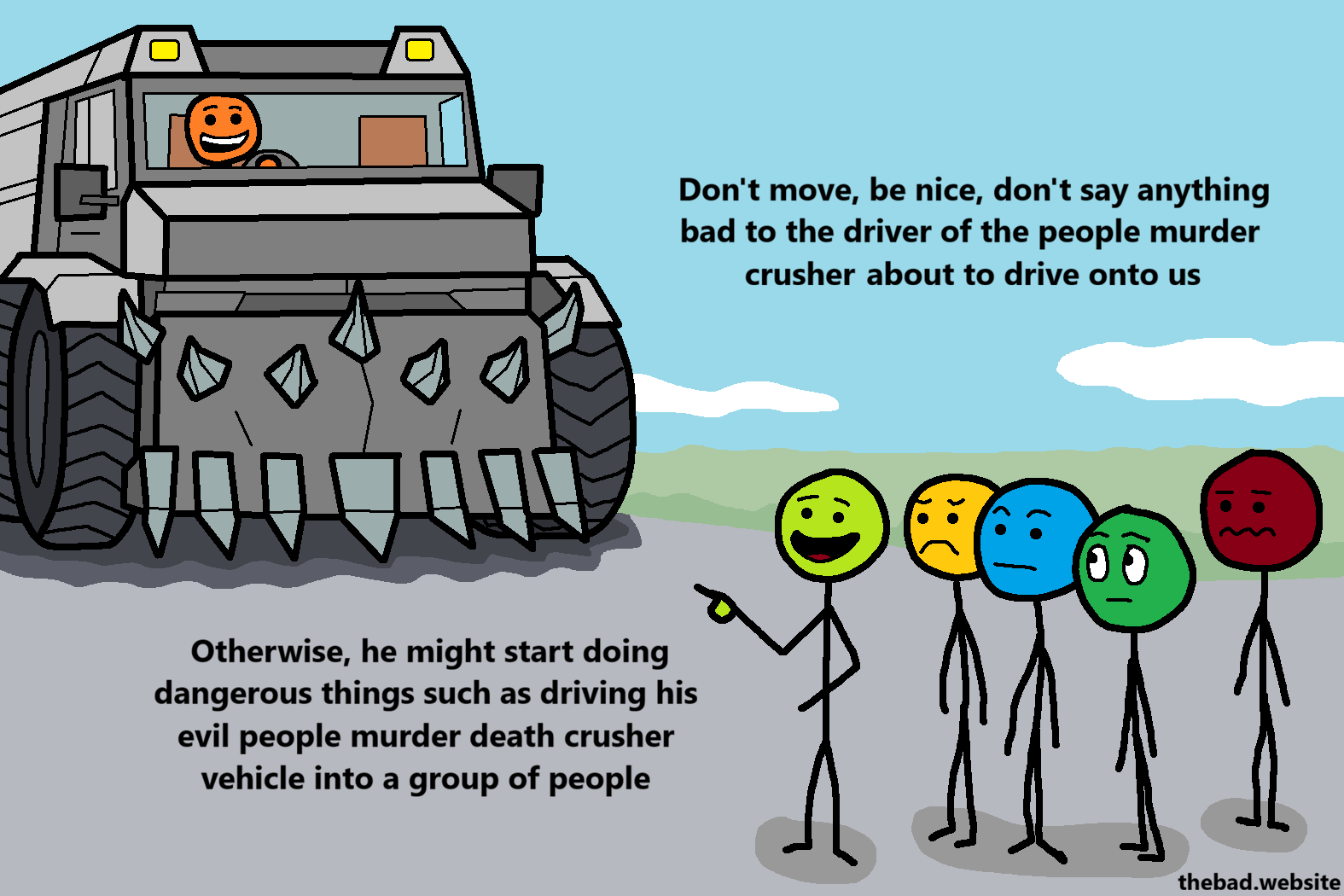 Honestly, the real violence here is the one you’re directing at the driver of the people murder crusher