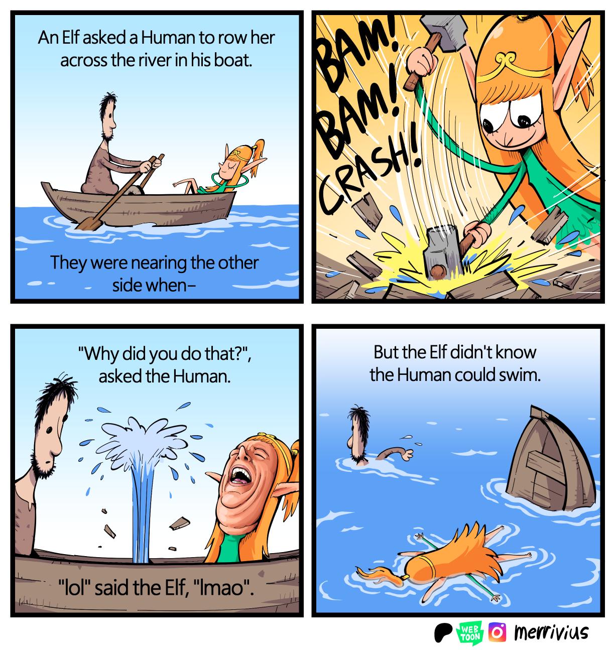 What a twist. The guy who owns a boat knows how to swim. I do enjoy the abject stupidity of the elf’s hatred for humans in this comic.