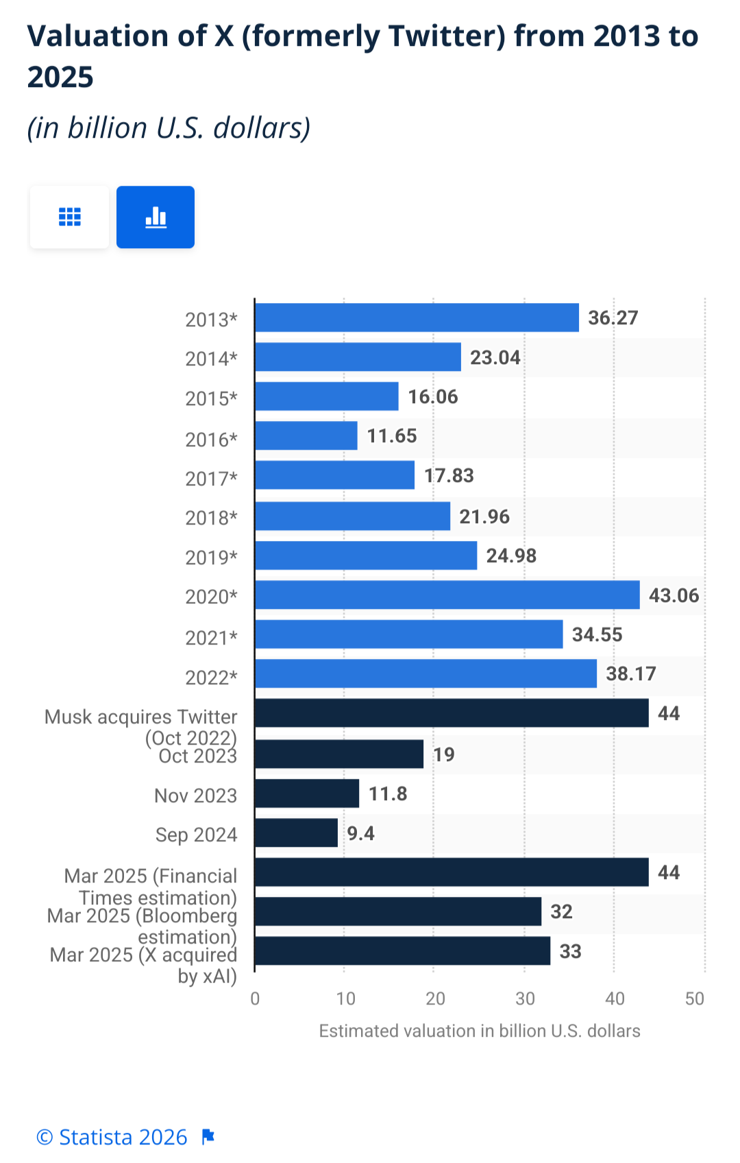 Last I’ve been able to find Twitter was valued at $33B when xAI bought it. But that was clearly an overvalued sale. Just look at the valuation over time.