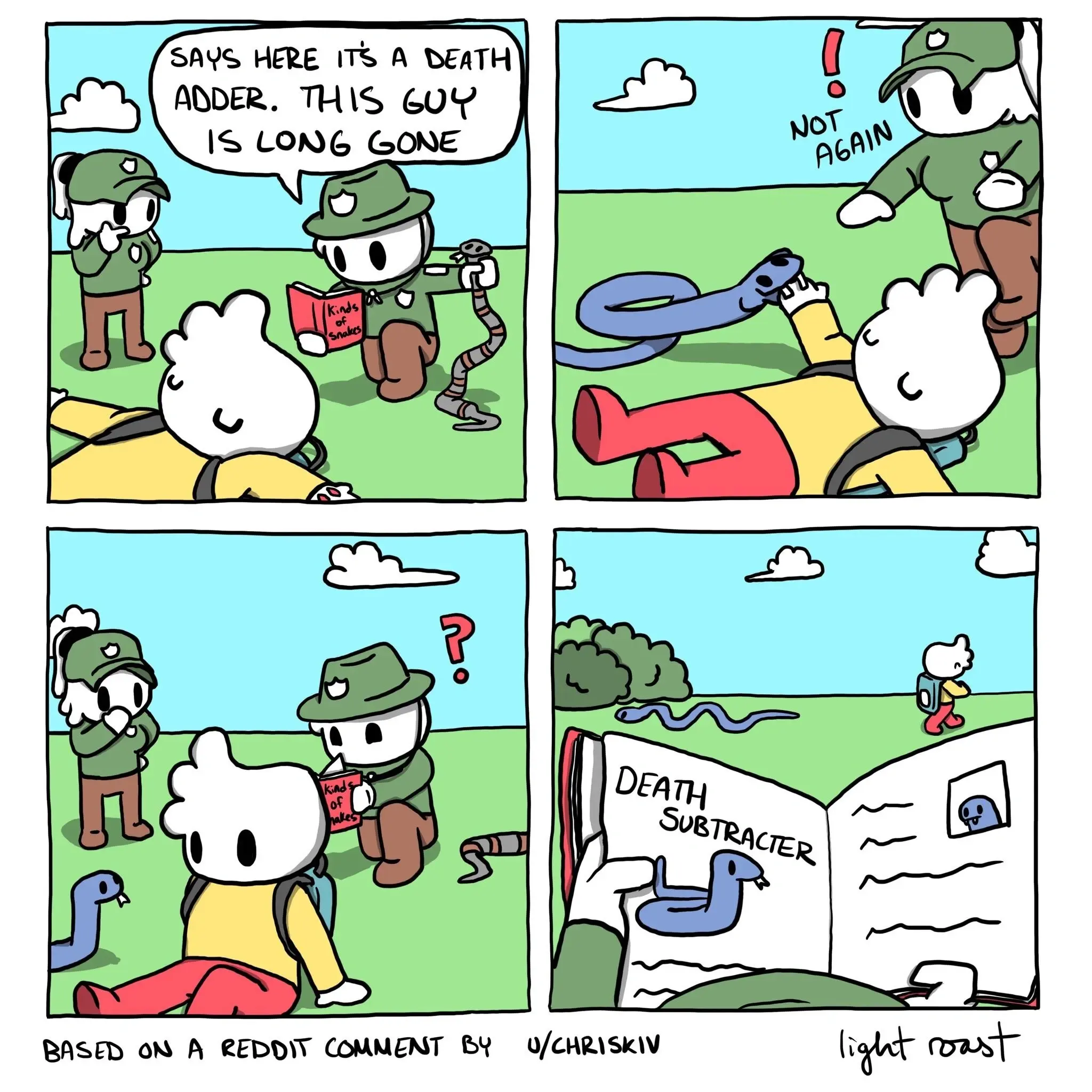 Reminds me of a joke, if you make opposite of death adder its life subtracter, still deadly