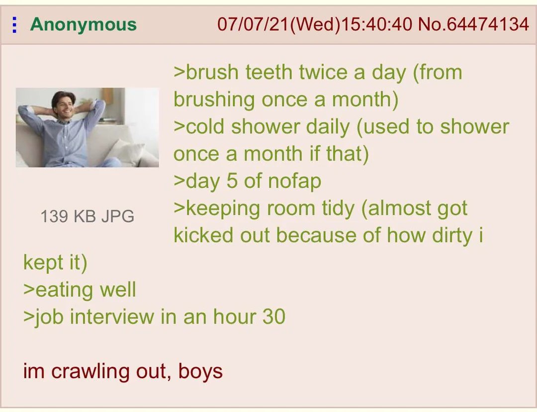 4chan is a bit of a manosphere hotspot. It’s why some people’s alarm bells are ringing about the nofap-part, too. If we assume that the post isn’t actually real (as is common on 4chan), it might even be straight-up manosphere-derived nofap propaganda.
