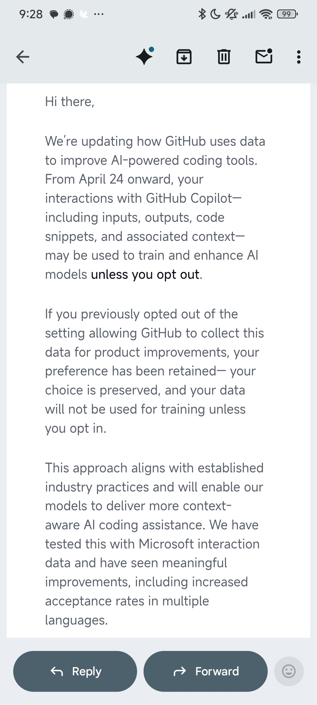 I just went in and opted out, but setting up my sellfhosted gitea instance has just moved to the top of my todo list. I already have a postgres database server running, and a VM where I can run docker containers so I’m excited to get all of my code out of there.