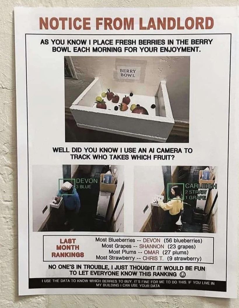 A photograph of an A4 poster tacked to a white wall, titled “Notice from Landlord” in red capitals. Below the title, the poster reads “As you know, I place fresh berries in the berry bowl each morning for your enjoyment.” A photo of a white wooden open-top box attached to a wall is shown on the poster, with a small paper label reading “Berry Bowl” taped to the wall behind the box. Inside the box, an assortment of strawberries, blueberries, plums and green grapes are visible. Below the photo, the poster reads “Well, did you know that I use an AI camera to track who takes which fruit?” Two photos from a security camera mounted on the ceiling are shown side-by-side, each showing a different resident of the building reaching into the box to take a fruit. In each photo, a green rectangle frames the resident’s head, with a label showing the name of the resident and the type of fruit they have taken. The left photo reads “Devon, 3 blue” and the right photo reads “Carleigh, 2 Straw, 1 Grape”. Following the photos is a section titled “Last Month Rankings”, which reads “Most blueberries, Devon, 56 blueberries; most grapes, Shannon, 23 grapes; most plums, Omar, 27 plums; most strawberries, Chris T, 9 strawberries”. Below the rankings, the poster reads “No-one’s in trouble, I just thought it would be fun to let everyone know the ranking 🙂”. At the very bottom of the poster, a footnote is written in white text on a black background. It reads “I use the data to know which berries to buy. It’s fine for me to do this. If you live in my building I can use your data.”
