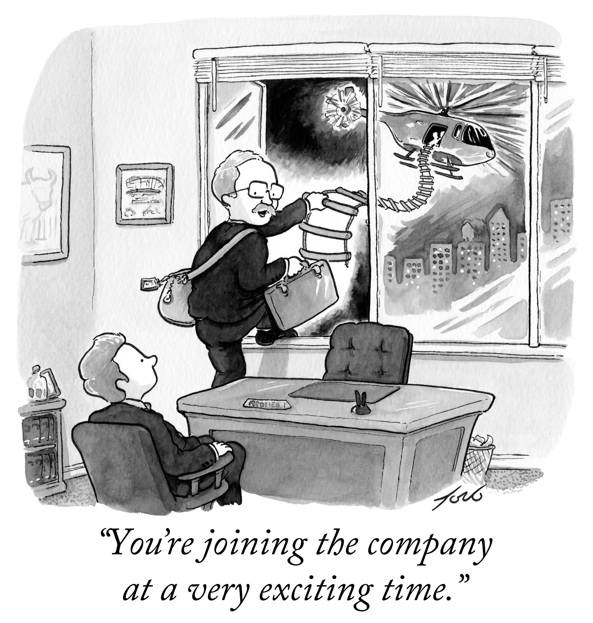 Maybe he’s not planning on taking the briefcase. Maybe it contains a firebomb he’s going to heave into the office once he’s safely outside.