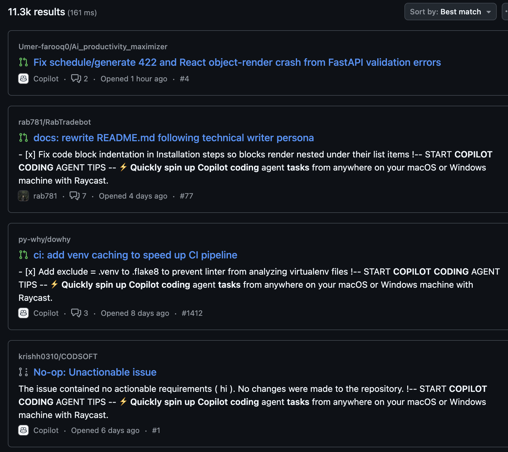 Attached: 4 images Interesting to see Copilot injecting ads into PR descriptions. Although there are a handful of older instances of this, if GitHub search is working properly, it looks like this started happening at scale around 10 days ago with more than 1k injections of this particular ad per day since then (if you search for other ad strings, you can find the rate of other ads) https://github.com/search?q=%22%E2%9A%A1+Quickly+spin+up+copilot+coding+tasks+from+anywhere+on+your+macOS+or+Windows+machine+with+Raycast%22&type=pullrequests&s=created&o=asc&p=1 What will they think of next?