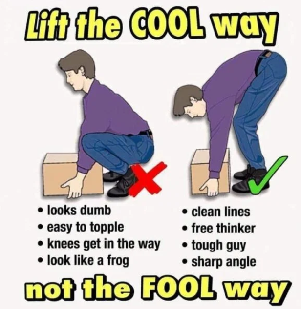 Essentially what they are trying to get you to do is use a powerlifting style squat/deadlift technique to lift everything. Which makes some sense. Powerlifters can lift a lot of weight. But it doesn’t make that much sense because most things in real life aren’t barbell shaped. They are weird and bulky and awkward and asymmetrical and have no good places to grab with your hands. You grab them however you can, and lift them however you can, because the job needs to get done. The human body is not a delicate flower that will wilt and die if you don’t use perfect squat technique to lift every object you ever lift until the day you die. We know this because you’ve lifted all sorts of things all sorts of ways and you’ve mostly been fine.