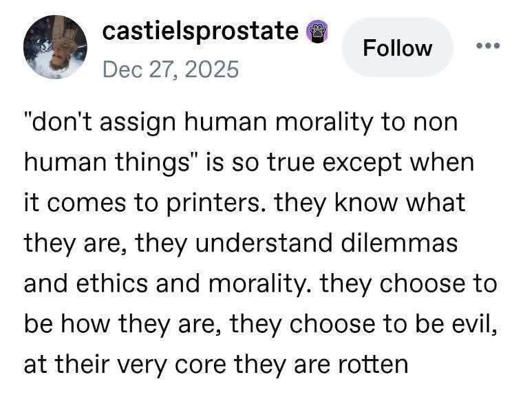 minus-squaresp3ctr4l@lemmy.dbzer0.comlinkfedilinkEnglisharrow-up9·12 hours agoTechnically, its not their fault, they were made that way and have no means of changing themselves… But that doesn’t change that they functionally are agents of evil. … They’re basically Orcs, but with even less agency.