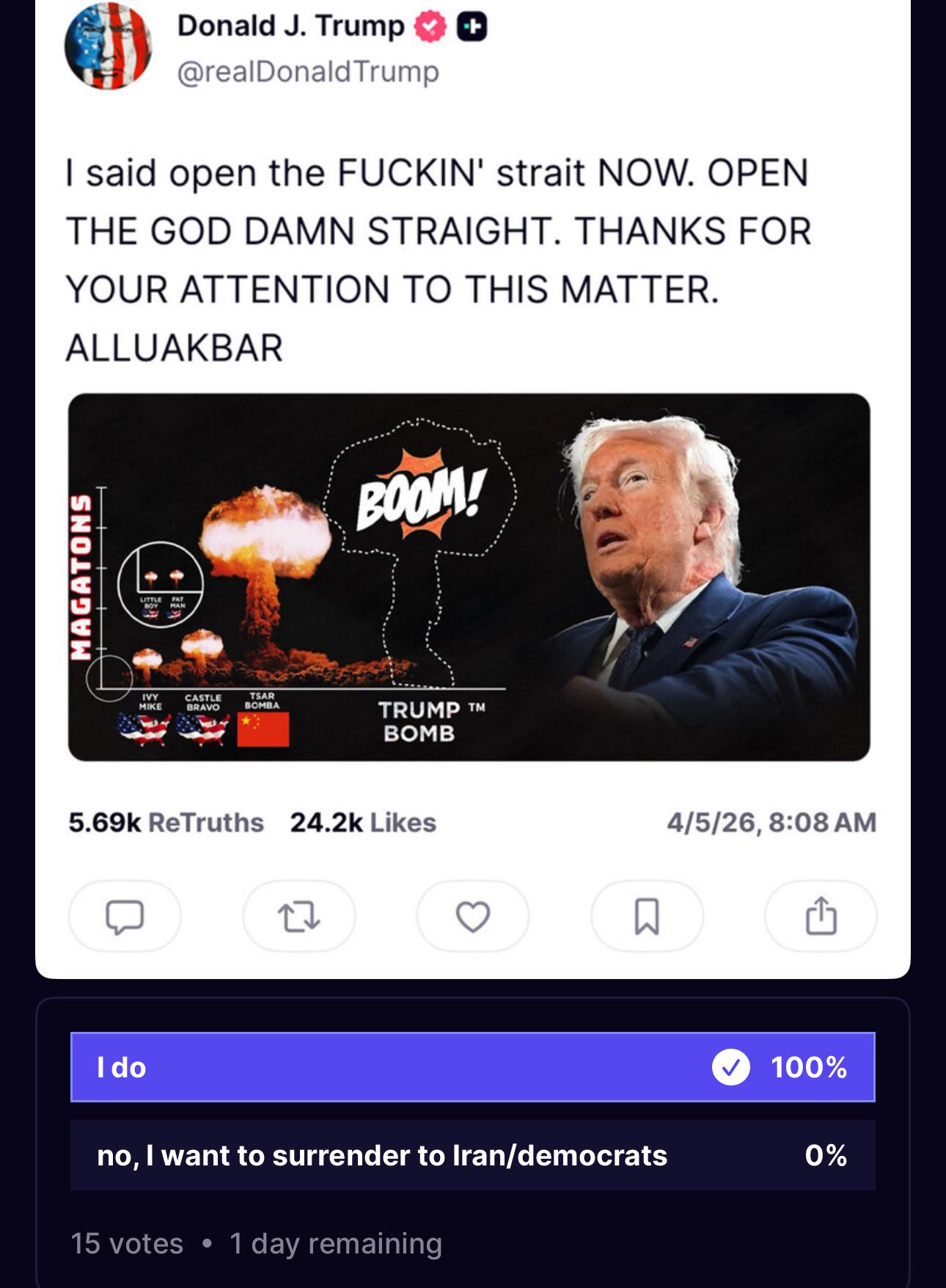 The poll is the funniest part to me. I do want to surrender to “Iran/democrats”.