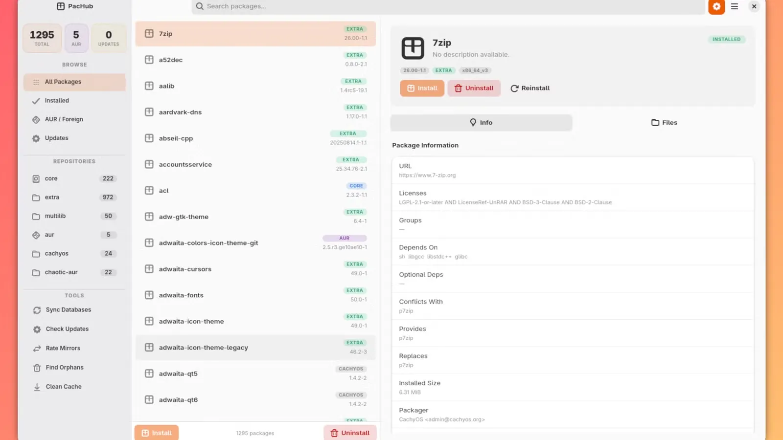 “PacHub provides a GTK4/libadwaita GUI for pacman and AUR, so you can avoid the terminal. PacHub can install/uninstall packages, perform upgrades, and provide