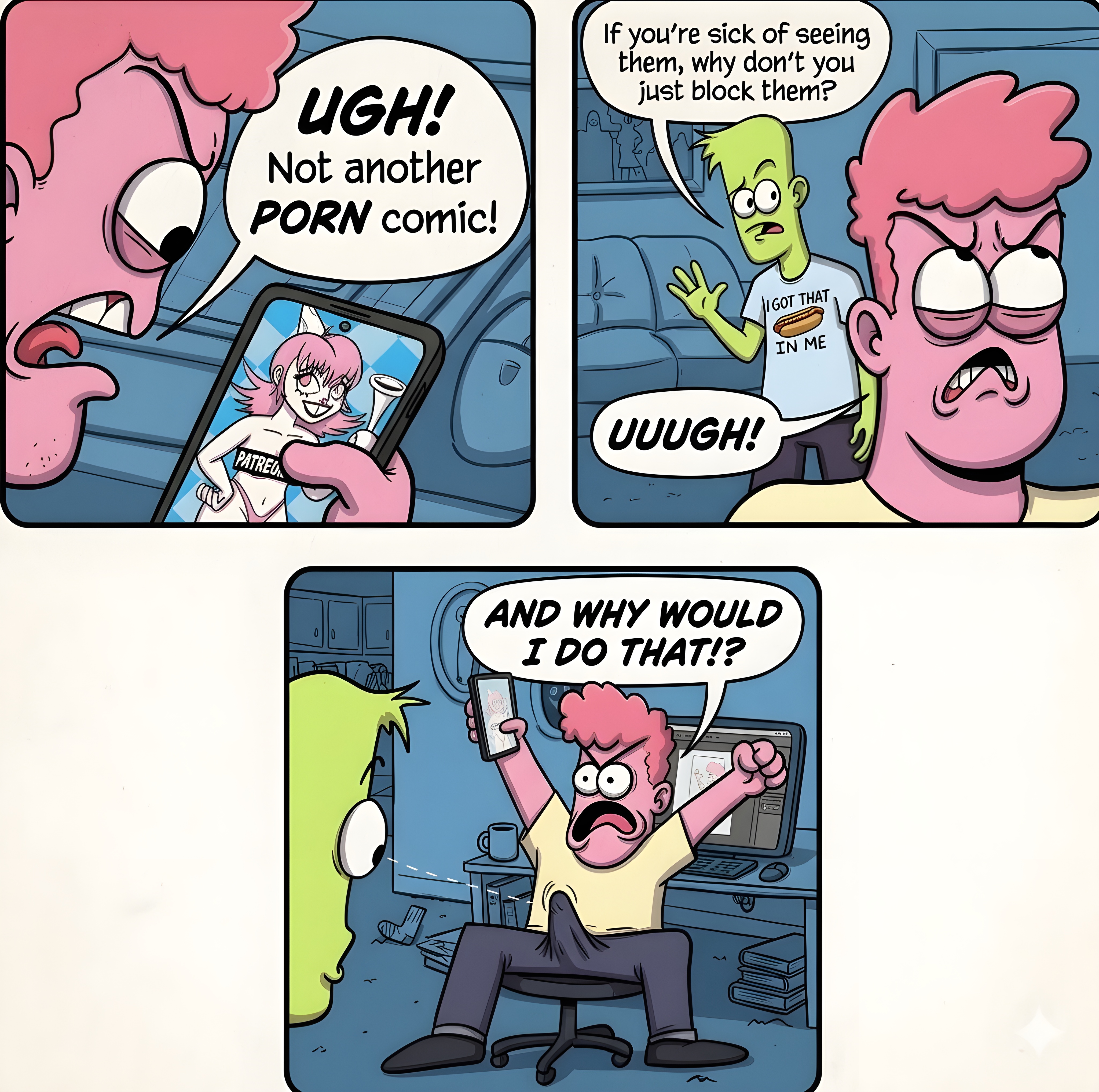 I think in this case porn comic is an allegory for beep themselves. If everyone is so upset at them, why not block the account? And that people get off on harassing them.