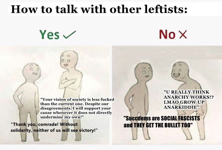 In any case, this is an argument over the validity a method, which is not what the meme is about. The meme isn’t saying “Don’t argue with other leftists when your positions clash!”, it’s saying "Remember that there is broad room for cooperation and allyship, and that a different kind of leftist is not automatically your enemy just because they have different end-goals."