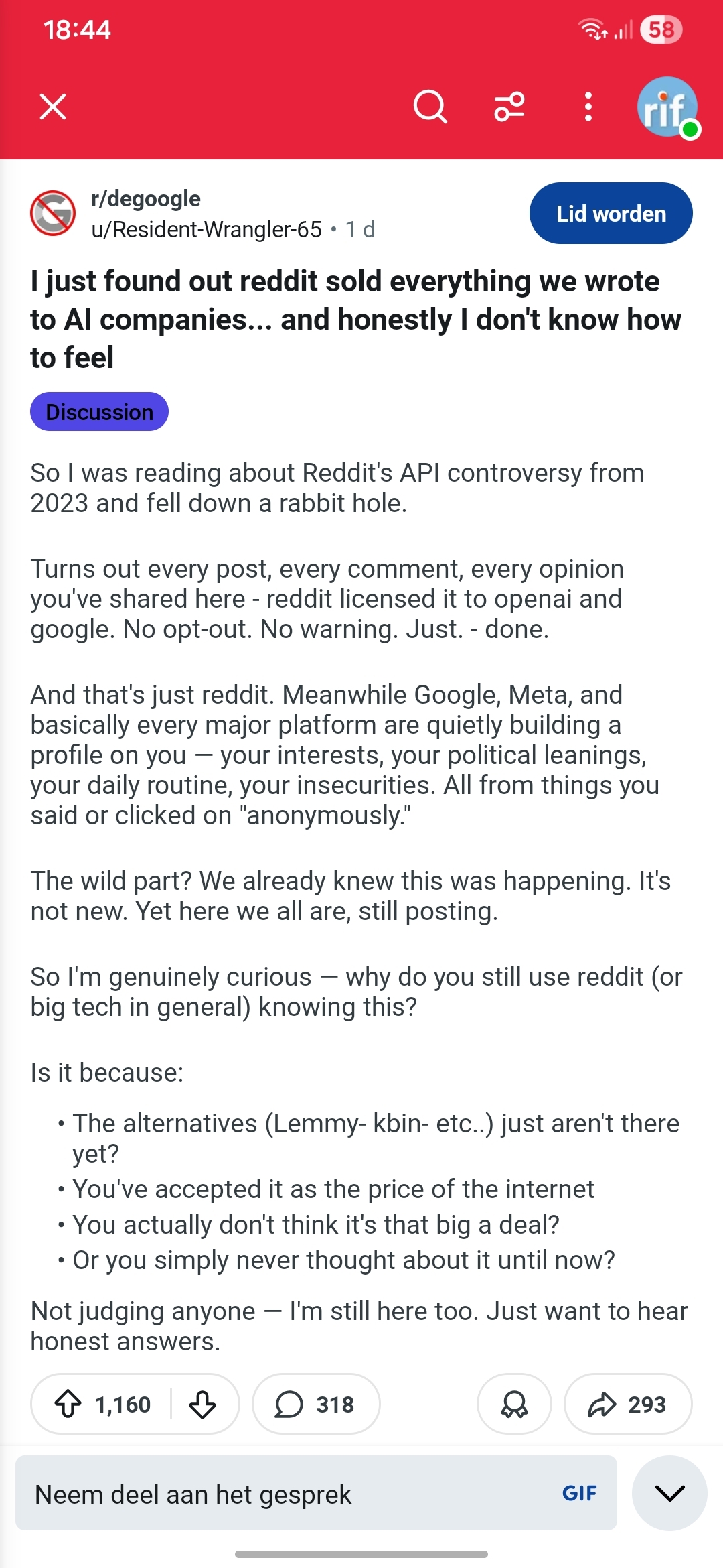 Turns out every post, every comment, every opinion you’ve shared here - reddit licensed it to openai and google. No opt-out. No warning. Just. - done.