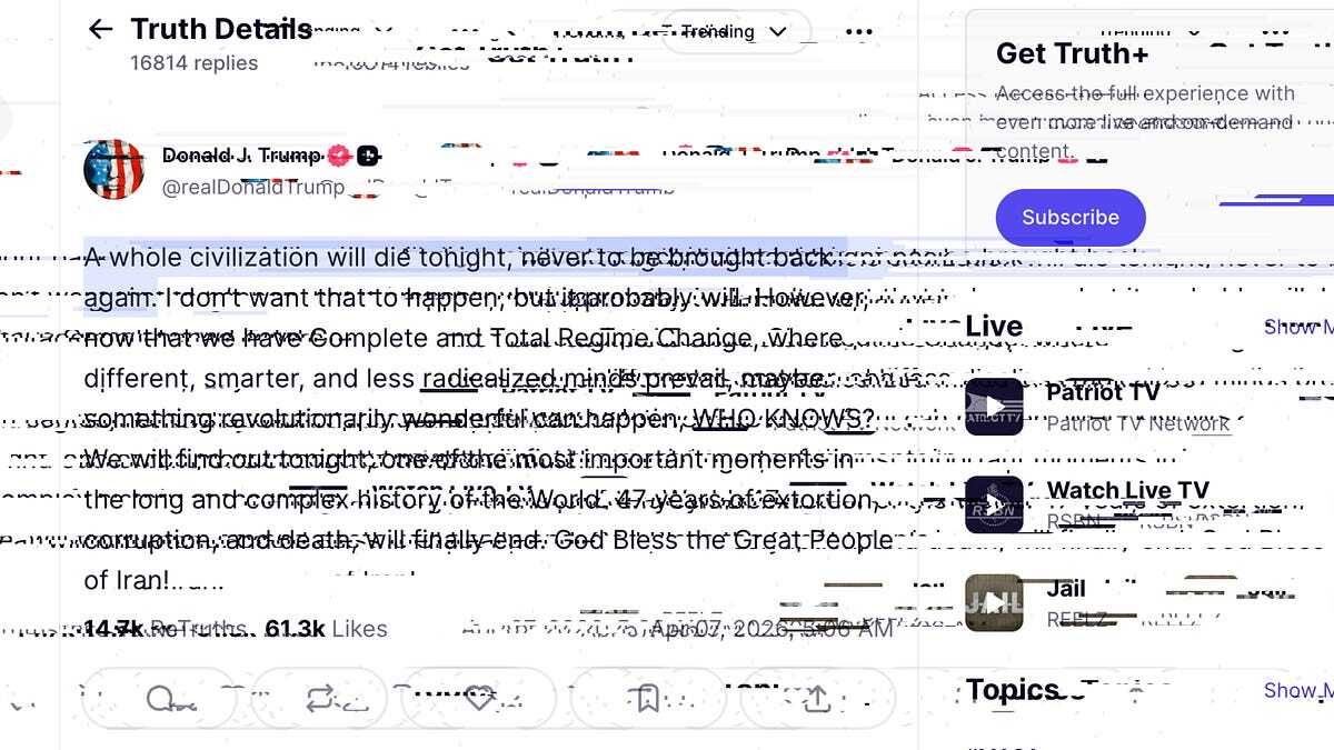 But this week should serve as a clarifying moment. The sitting American president explicitly promised a genocide then forced the Iranian people to wait for hours to see if they would be bombed “into the stone age” and the rest of the world to see if he would start World War III in earnest this time. Even a few years ago, Silicon Valley executives might have spoken out against such horrific declarations; intents to, in part, harness their AI, tools and technological infrastructure to such abject ends. Now they are silent; content, apparently, as long as Trump continues to give them favorable land use policy for their data centers and state AI law moratoria. If an industry that rose to cultural dominance by promising to be harbingers of progress—to improve people’s lives, to do no evil, to bring people together, to make a dent in the universe, and by using all of the above as a powerful recruitment tool—cannot draw the line here, then what’s left?
