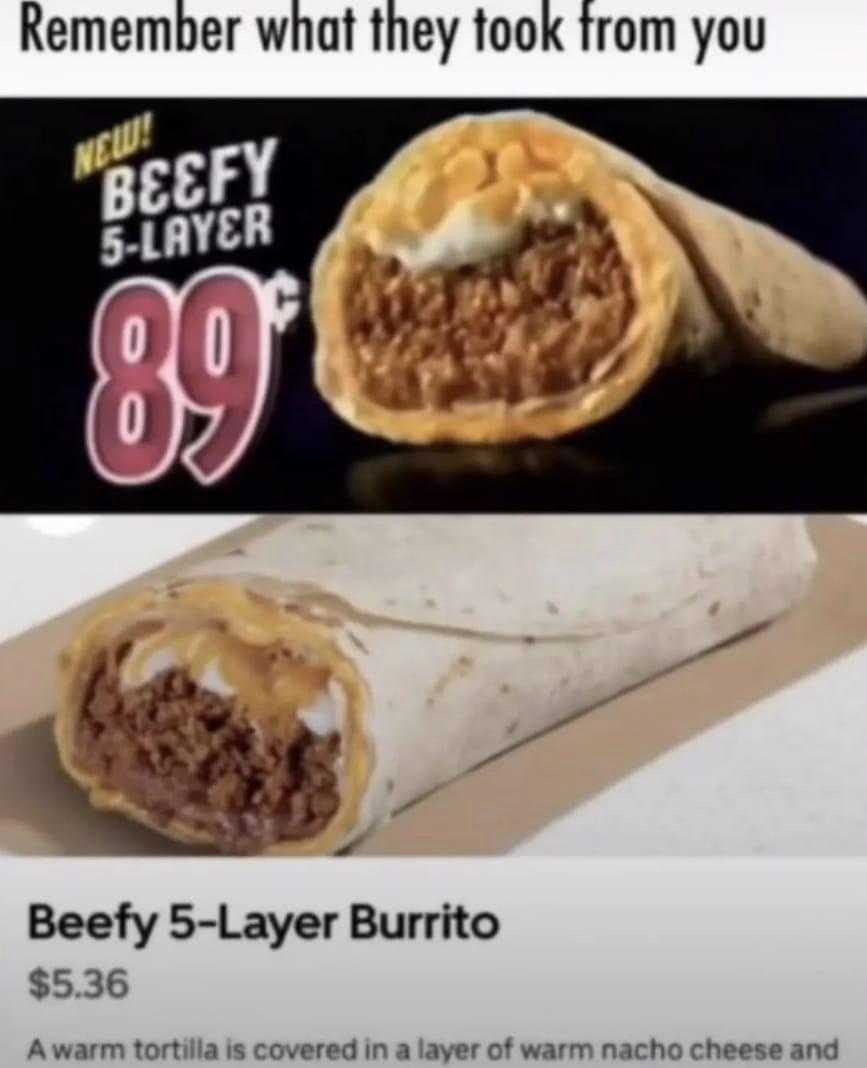 Damn. Around here you can still get the $7 box in which the beefy 5-layer burrito is one of five included items (chalupa, burrito, taco, dessert, and drink).