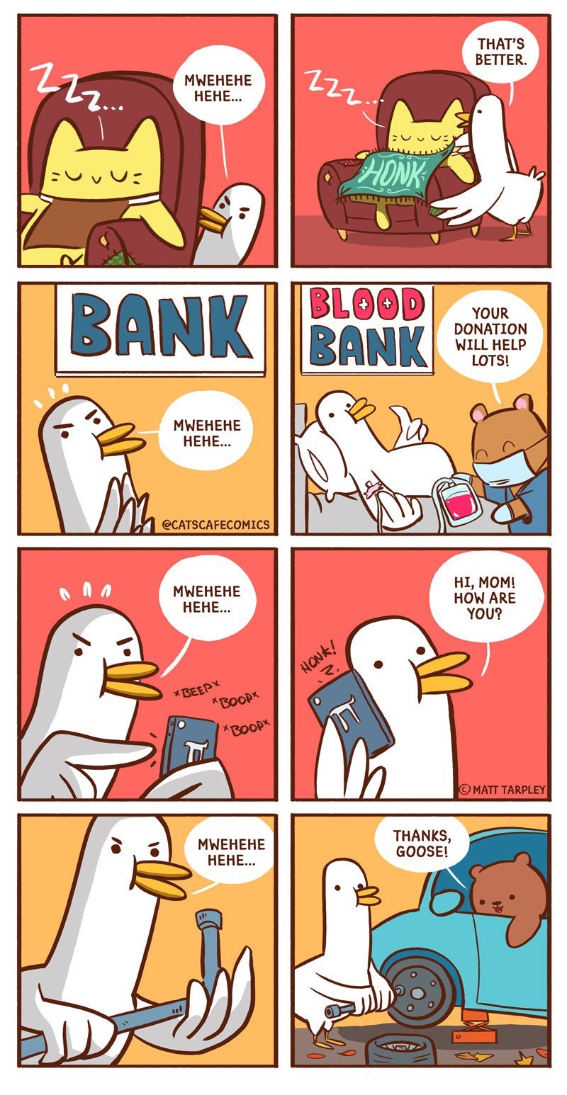 Yesterday I watched a goose slowly walk across the busiest road in town, holding up traffic as it meandered. As soon as it got to the other side, it turned around and slowly headed back.