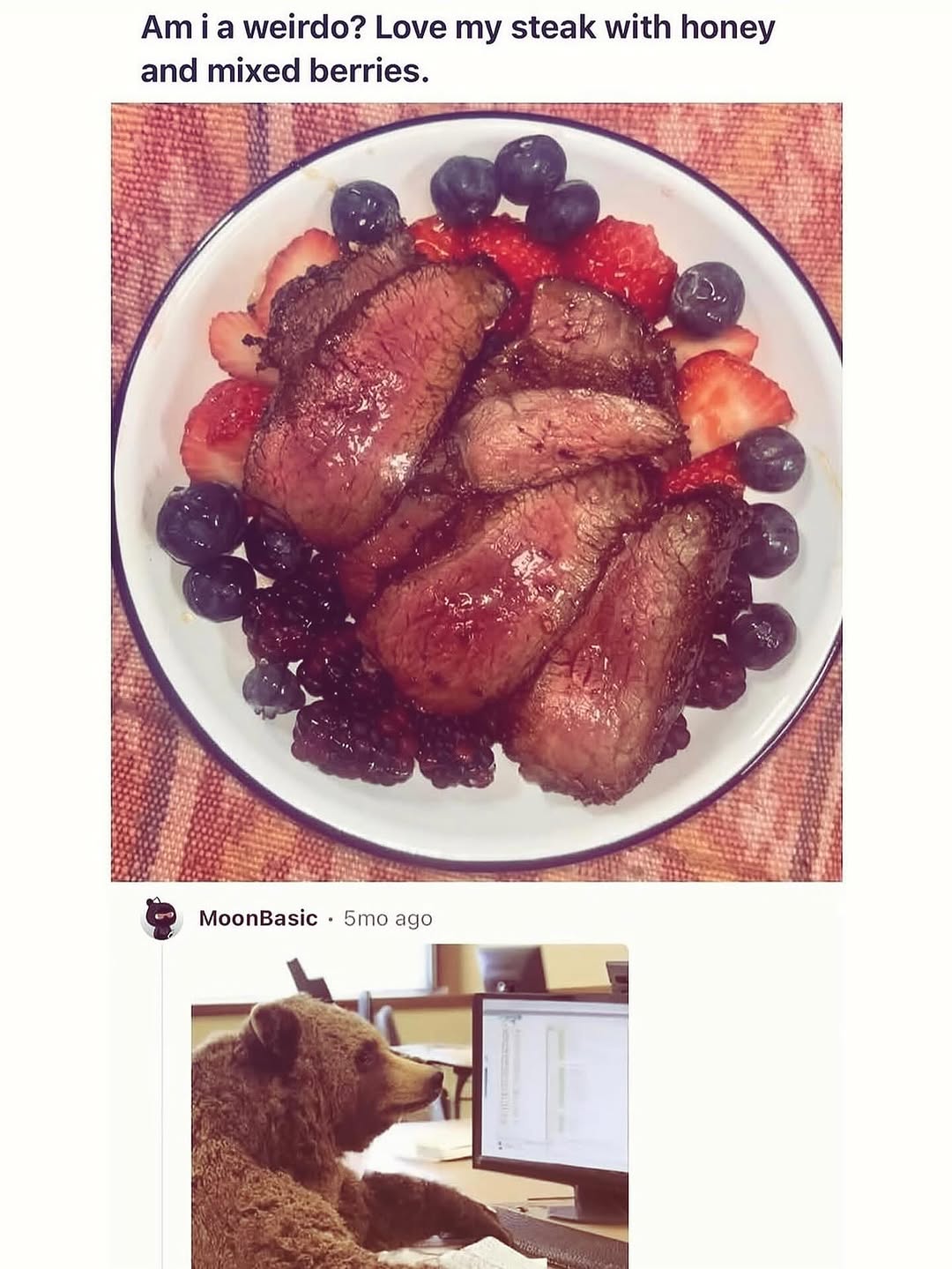 NotMaybe the gay kind.As long as it’s not slathered in honey, it’s probably pretty tasty. I’ve had steak with a drizzle of sweet glaze before and the flavors can complement one another nicely