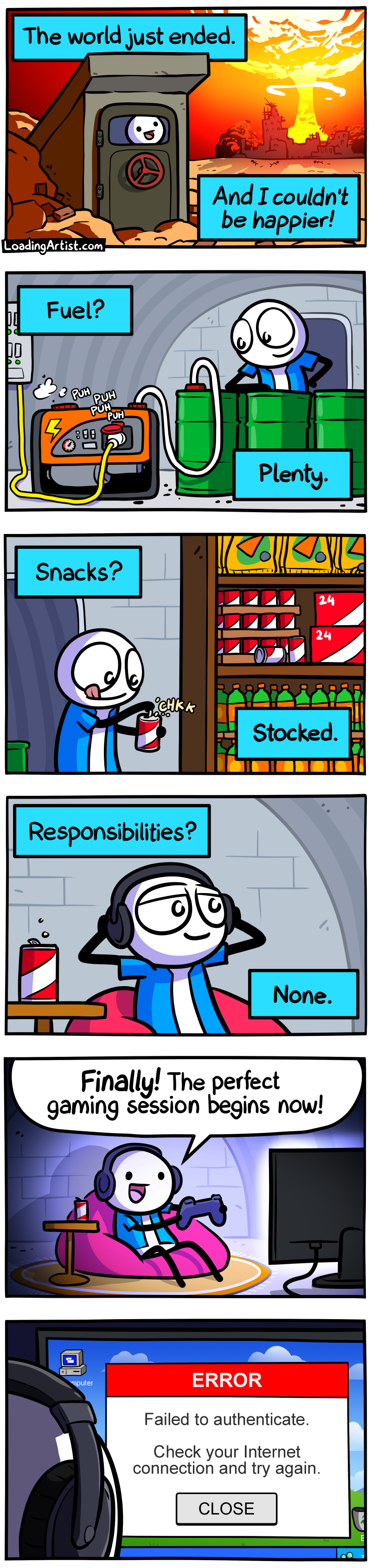 6-panel Loading Artist comic. 1: “The world just ended. And I couldn’t be happier!” Blue shirt guy grins at a nuclear blast outside his bunker. 2: “Fuel? Plenty.” He admires his fuel barrels. 3: “Snacks? Stocked.” He opens a soda beside shelves of junk food. 4: “Responsibilities? None.” He relaxes into a beanbag with headphones. 5: “Finally! The perfect gaming session begins now!” 6: Screen says: “Failed to authenticate. Check your Internet connection.”