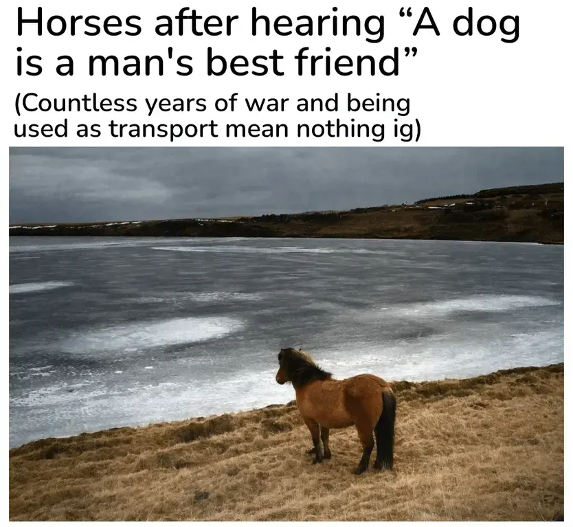 Yeah, it sounds like dogs are man’s best friend, and horses are that other one who thinks they’re good friends with man, but it turns out that man was just using horses like a tool and telling horses that a friend would carry all of man’s stuff and would fight for man, and man is always sending horses out to buy stuff without ever paying horses back. Man is actually a bullying horses!