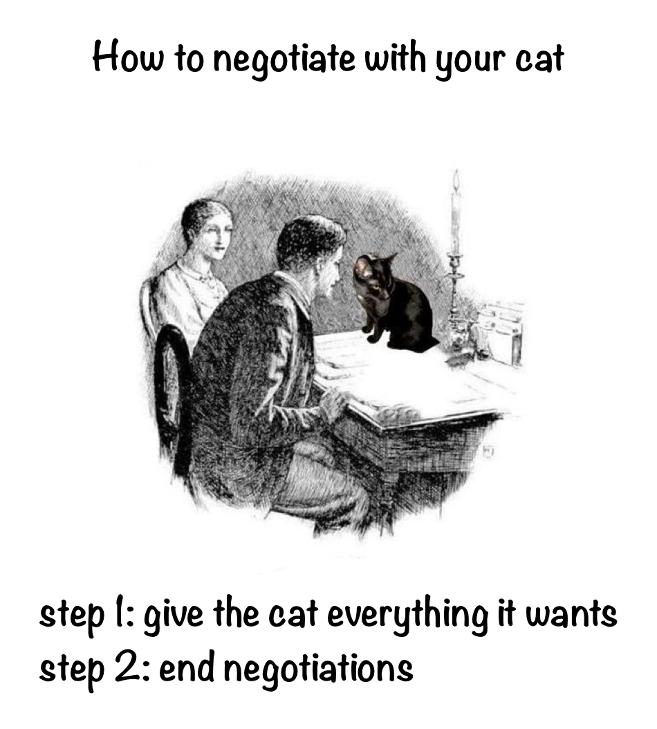 Step 0: You don’t. You are Cat’s subject, all you ever were belonged to Cat when you were no more than a gleam in your parents’ eyes. “Negotiation” is devoid of meaning to you. You are perfectly happy.