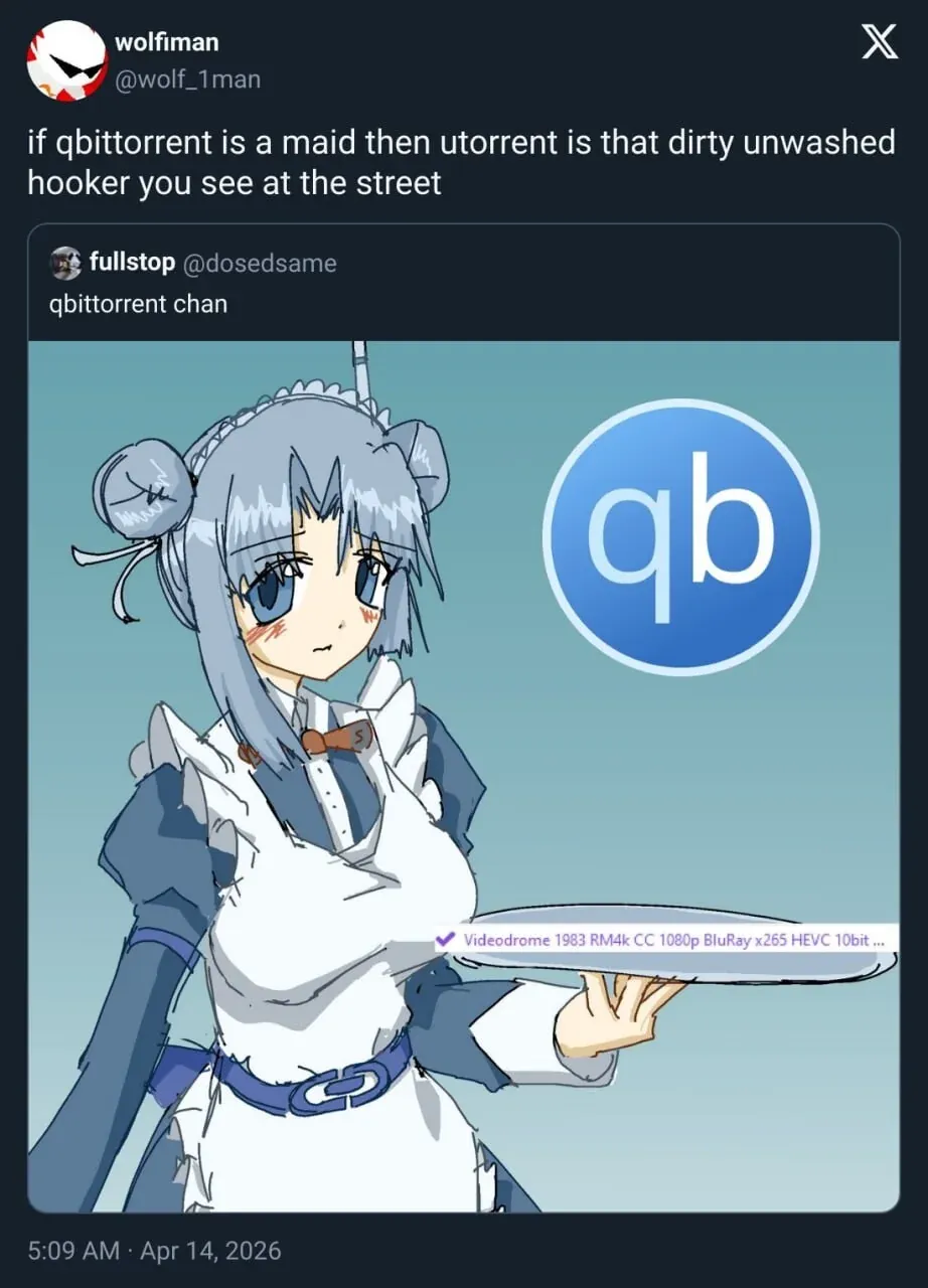 cm0002 to Piracy: ꜱᴀɪʟ ᴛʜᴇ ʜɪɢʜ ꜱᴇᴀꜱ@lemmy.dbzer0.comEnglish · 2 days agothank you qbittorrent chan :3lemmy.mlimagemessage-square19fedilinkarrow-up1193