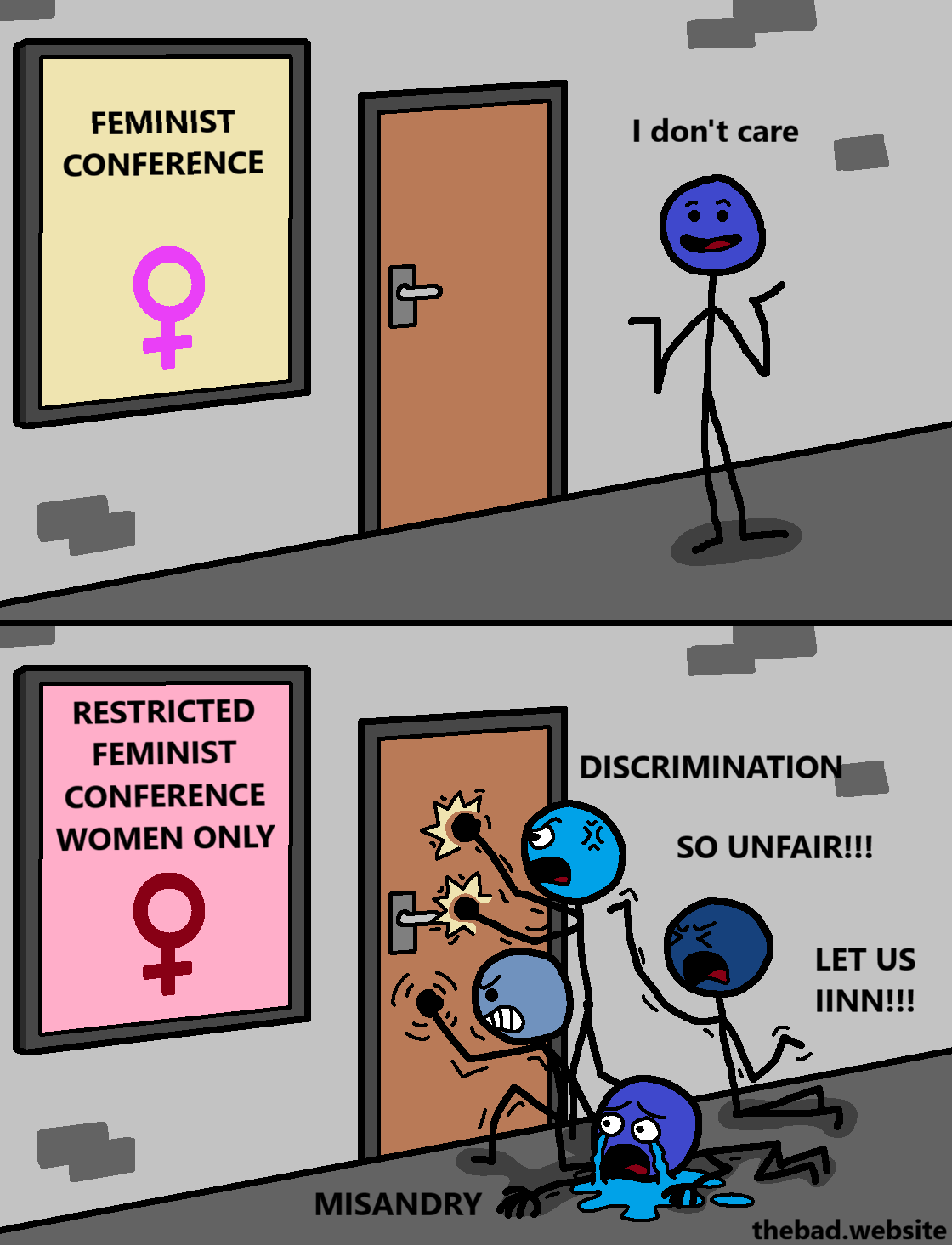 [next to the same door, the sign now says RESTRICTED FEMINIST CONFERENCE WOMEN ONLY, there are now four blue characters desperately banging on the door, one is reduced to tears on the floor, they are shouting]