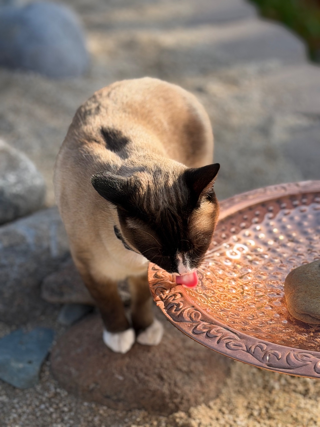 Butters looks a lot like my furbaby, including the seal point footies! Her opinion on water seems to be “The wider the bowl, the better”. I think she doesn’t like feeling her whiskers get squeezed by a narrow bowl. She would love a super-wide birdbath like this.