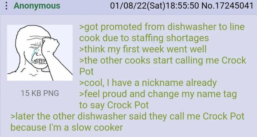 And? They’re new and that isn’t what they were hired on for. Of course they’re slow. The fact that that is what OOP is being teased for means that overall they’re doing alright. Considering they’re on 4chan they’re lucky their nickname isn’t bog crack or something.