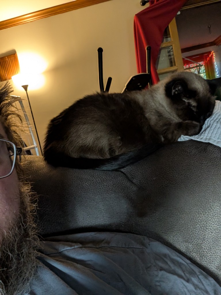 Now she looks like this. (Please try to ignore my disheveled hair. A recent surgery has reduced my opportunities to shower.)edit: My wife likes to describe our pets by their apparent flavor. Ripley, shown above, is s’more flavored. Another cat, a striped one another lemming once described as “standard issue cat,” hasn’t been given a flavor. Instead, because she has one white toe, she “stepped in milk.”