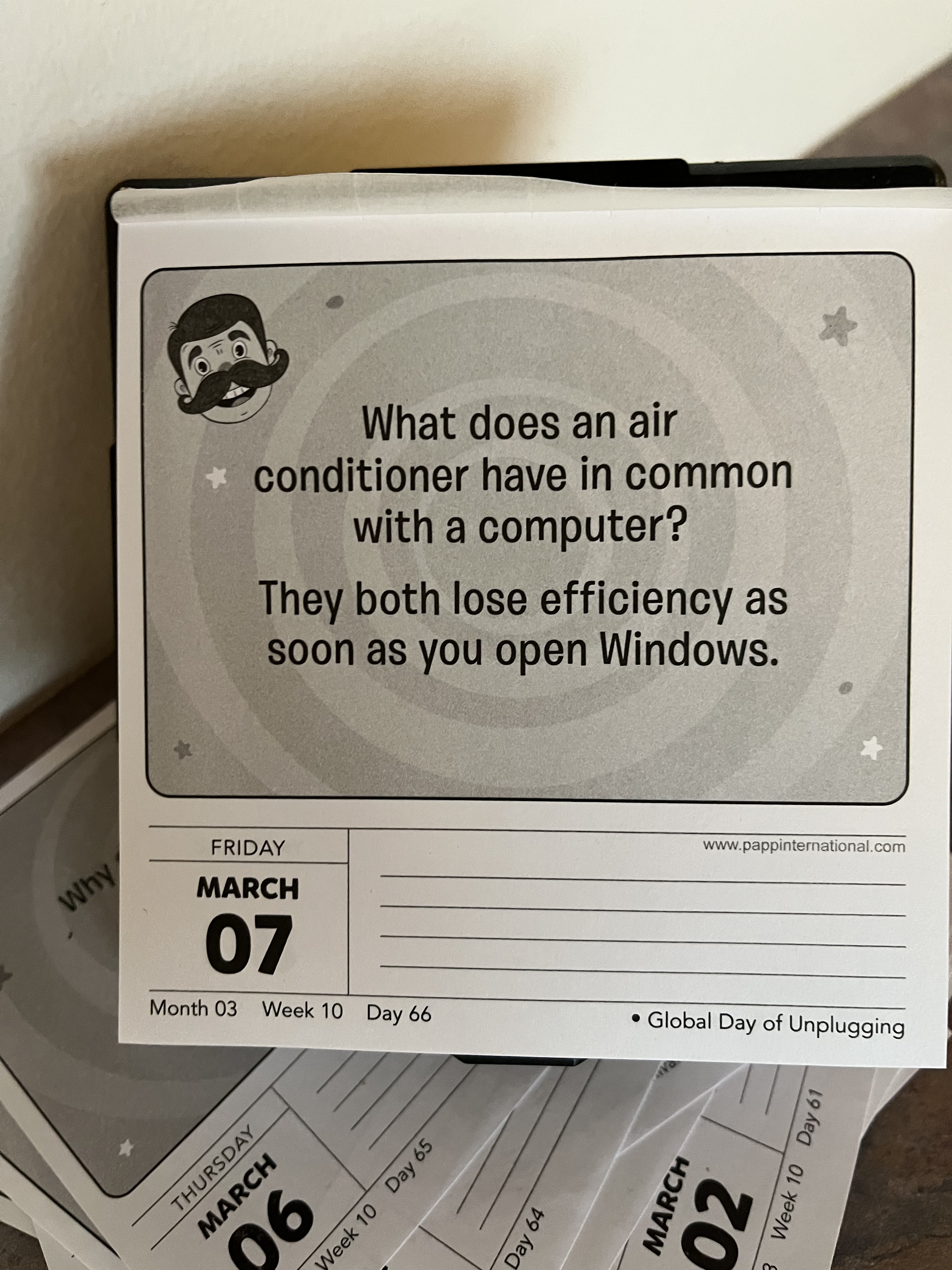 Ack@lemmy.ca to GNU+Linux Humor@lemmy.ml · 9 months agoDad joke page-a-day calendarlemmy.caimagemessage-square1fedilinkarrow-up11file-textcross-posted to: linuxmemes@lemmy.world