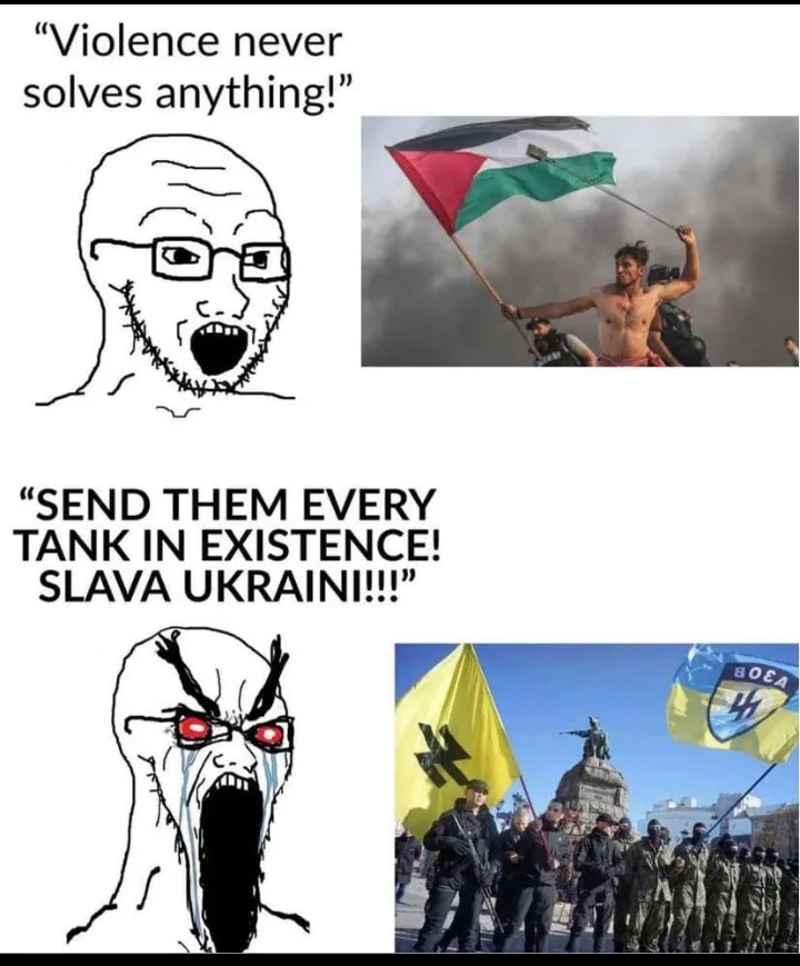arrow-up11image"Violence is never the answer" unless it is white people doing itlemmy.mlSpectre@lemmy.ml to Memes@lemmy.ml · 9 months agomessage-square17fedilink
