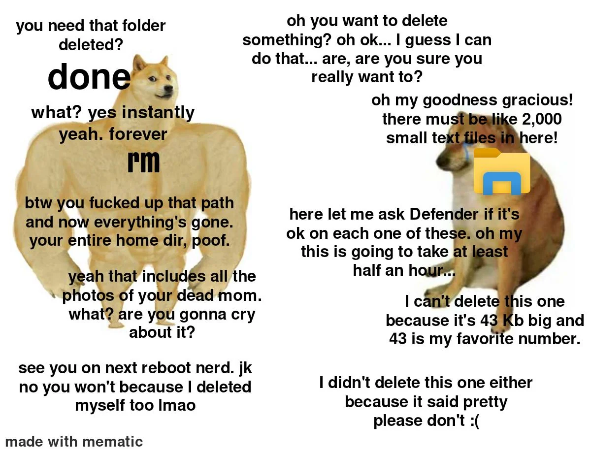 the linux-file-deletion is used as a example for good software design. It has a very simple interface with little room for error while doing exactly what the caller intended.