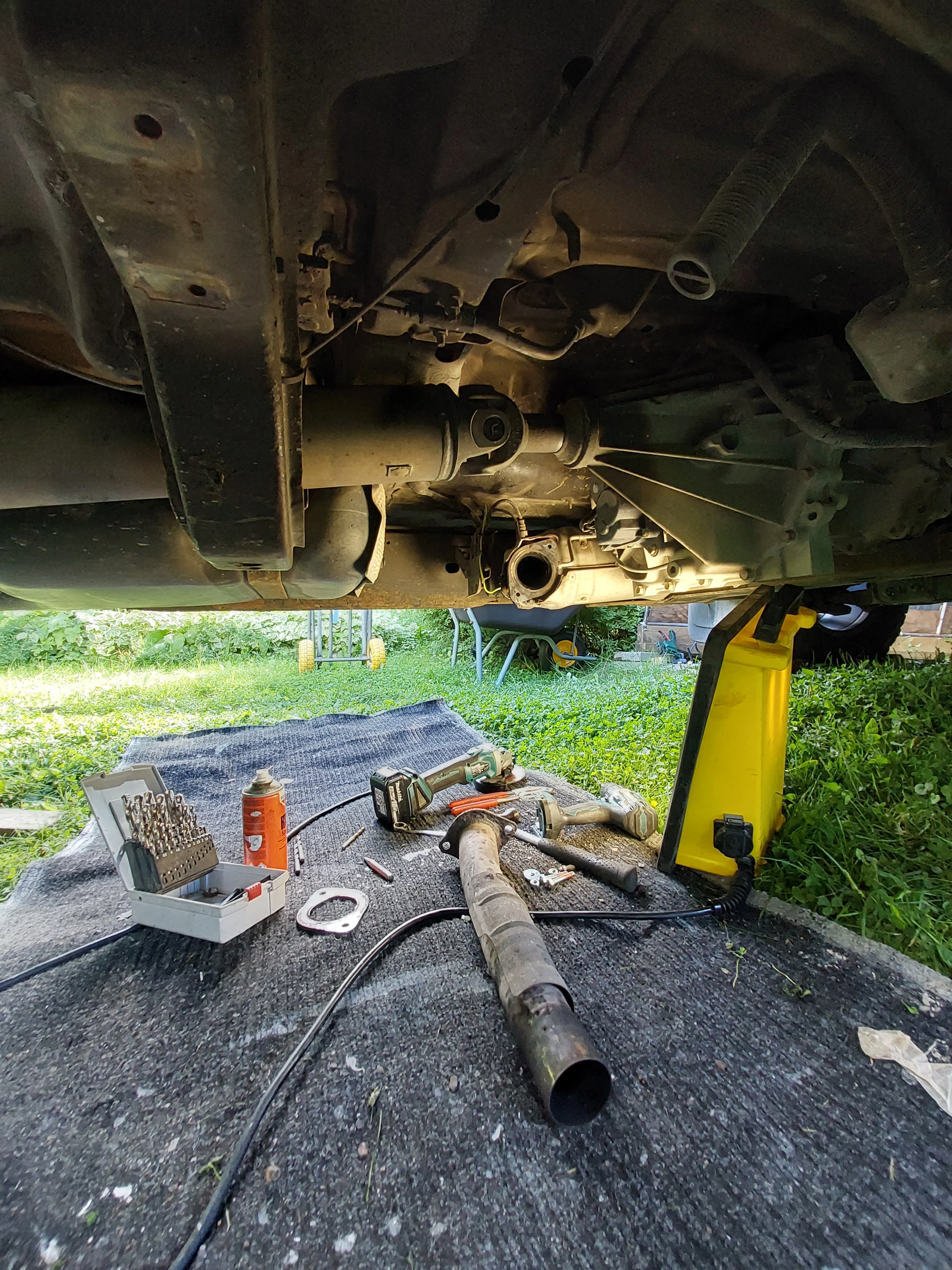 I didn’t actually mean to remove that piece. The bolts and nuts had rusted away, and it fell off while I was hammering the old exhaust loose. I had to cut the remaining bolt shafts from the DPF flange and drill new holes for through-bolts.