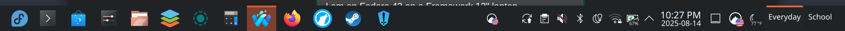 The second thing is the Activity Bar widget. Right now it shows my Activities as Everyday and School in text horizontally at the end of the panel. It would be great if it could be a vertical switcher or small icons or something. As it is it takes up a good amount of space on the panel. I attached an image.