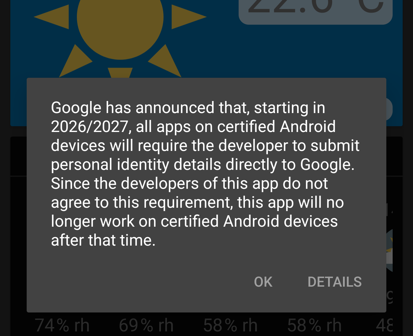 Google has announced that, starting in 2026/2027, all apps on certified Android devices will require the developer to submit personal identity details directly to Google. Since the developers of this app do not agree to this requirement, this app will no longer work on certified Android devices after that time.