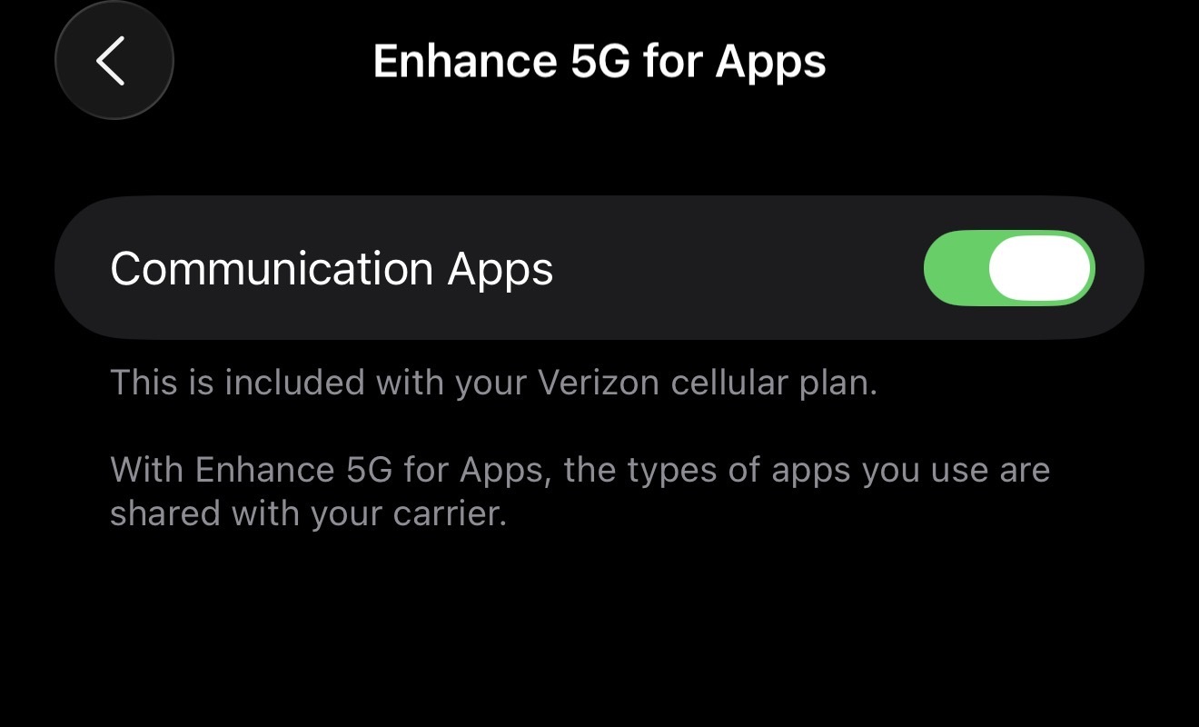 Just updated to iOS 26 and a few hours later got this notice about “enchanted 5g” for some apps. I had no idea what it was, so I checked the details and saw that it was automatic enabled and shares info about what apps you use with Verizon. If it wasn’t for this notification I would have no idea this was running.