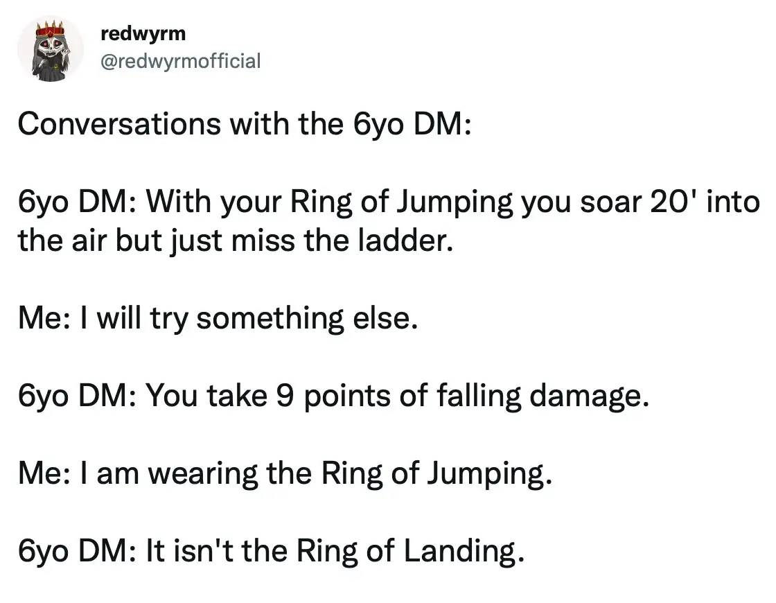 6yo DM: “You encounter a corpse wearing a ring of jumping.”