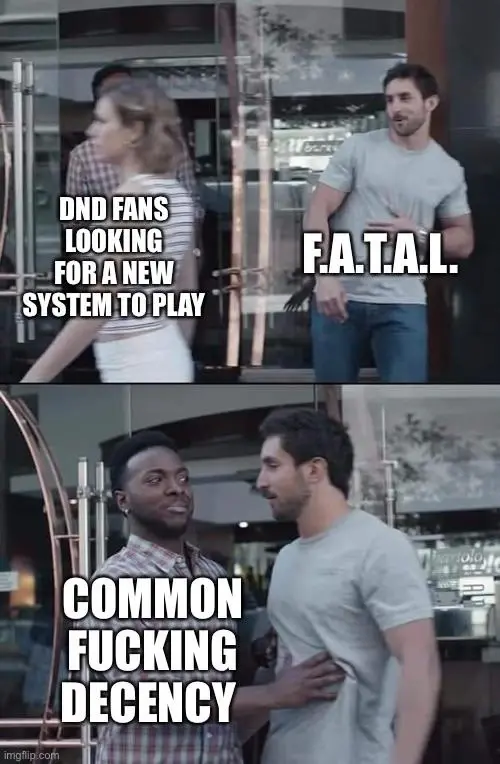 FATAL is, somehow, simultaneously a masterclass in realism for the sake of realism, and also the most unrealistic game ever made. There is a specific stat for how many words per minute you can speak, a stat for the longest word you know, and a stat for how far back your earliest memory is. But also, the system uses the concept of “humors” as something that actually has real-world effects, has the aforementioned critical system where you can crit individual organs but leave the surrounding organs unscathed, the ability to roll up a 4 year old with B-cups, and all kinds of other absolutely deranged nonsense that has no business whatsoever calling itself realistic.