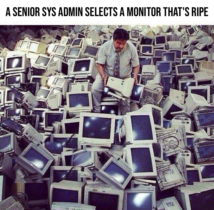 ☆ Yσɠƚԋσʂ ☆@lemmy.ml to Programmer Humor@lemmy.mlEnglish · edit-23 months agoA senior sys admin selects a monitor that's ripelemmy.mlimagemessage-square0fedilinkarrow-up11cross-posted to: programmer_humor@programming.dev